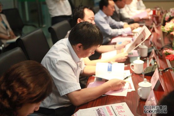 會領導認真閱讀著集團文化宣傳手冊與開元報